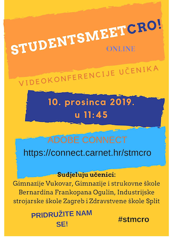 Prva StudentsmeetCRO videokonferencija učenika za učenike održana je u svibnju prošle školske godine 2018./2019. na prijedlog profesorice Marijane Smolčec iz ogulinske Gimnazije i strukovne škole Bernardina Frankopana. Njoj su se se zajedno sa svojim učenicima pridružili profesori iz drugi škola diljem Hrvatske. Više pročitajte ovdje.
