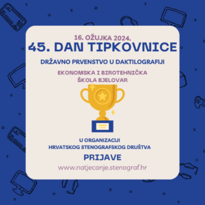 Hrvatsko stenografsko društvo i ove godine održava tradicionalno državno prvenstvo u kompjutorskoj daktilografiji, desetoprstnom pisanju na tipkovnici. Dan tipkovnice održava se već 45. godinu za redom, a sudjelovati mogu sve osnovne i srednje škole iz cijele Hrvatske.