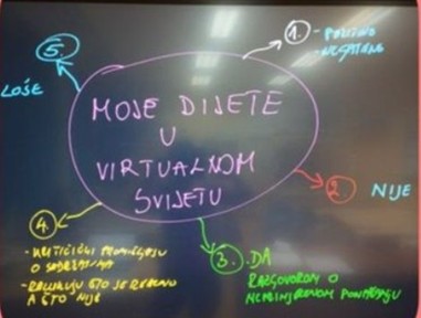 Cilj ove radionice je bio prepoznati pozitivne i negativne utjecaje medija na djecu i kako smanjiti negativne utjecaje medija na djecu. Na početku radionice su roditelji izdvajali pozitivne i negativne utjecaje medija, društvenih mreža i interneta na njihovu djecu. Nakon toga su roditelji raspravili o tome jesu li njihova djeca izložena negativnom utjecaju medija, razgovaraju li sa svojom djecom o utjecaju medija na sliku koju dijete ima o sebi. Roditelji su zaključili da mediji mogu utjecati na sliku koju njihovo dijete ima o sebi (ljepota, tjelesna masa) i da razgovaraju s djecom o tome da u medijima često nisu prikazane realne fotografije. Roditelji i razrednica su došli do zaključka da bismo s djecom trebali češće razgovarati o lažnoj stvarnosti koju nam mediji često prezentiraju.