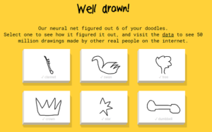 Prva u redu bila je aplikacija Quick, draw! u kojoj je potrebno prepoznati nacrtane crteže. Nakon toga su upoznali neki od eksperimenata umjetne inteligencije za crtanje, kao što je Autodraw, aplikacija koja nakon nekoliko crtačkih poteza učenika pokušava pogoditi na temelju čega učenik želi nacrtati veliku bazu crteža koju posjeduje, te nudi svoje ispravne crteže iz baze podataka crteže koje učenik potom odabire ako mu se vlastiti crtež ne sviđa, a ne poznaje kako to drugačije nacrtati. Sljedeća je aplikacija Magic Sketchpad, aplikacija koja svaki put kada podignite olovku, ona pokušava dovršiti potez i uskladiti crtež s kategorijom koju je učenik izabrao.