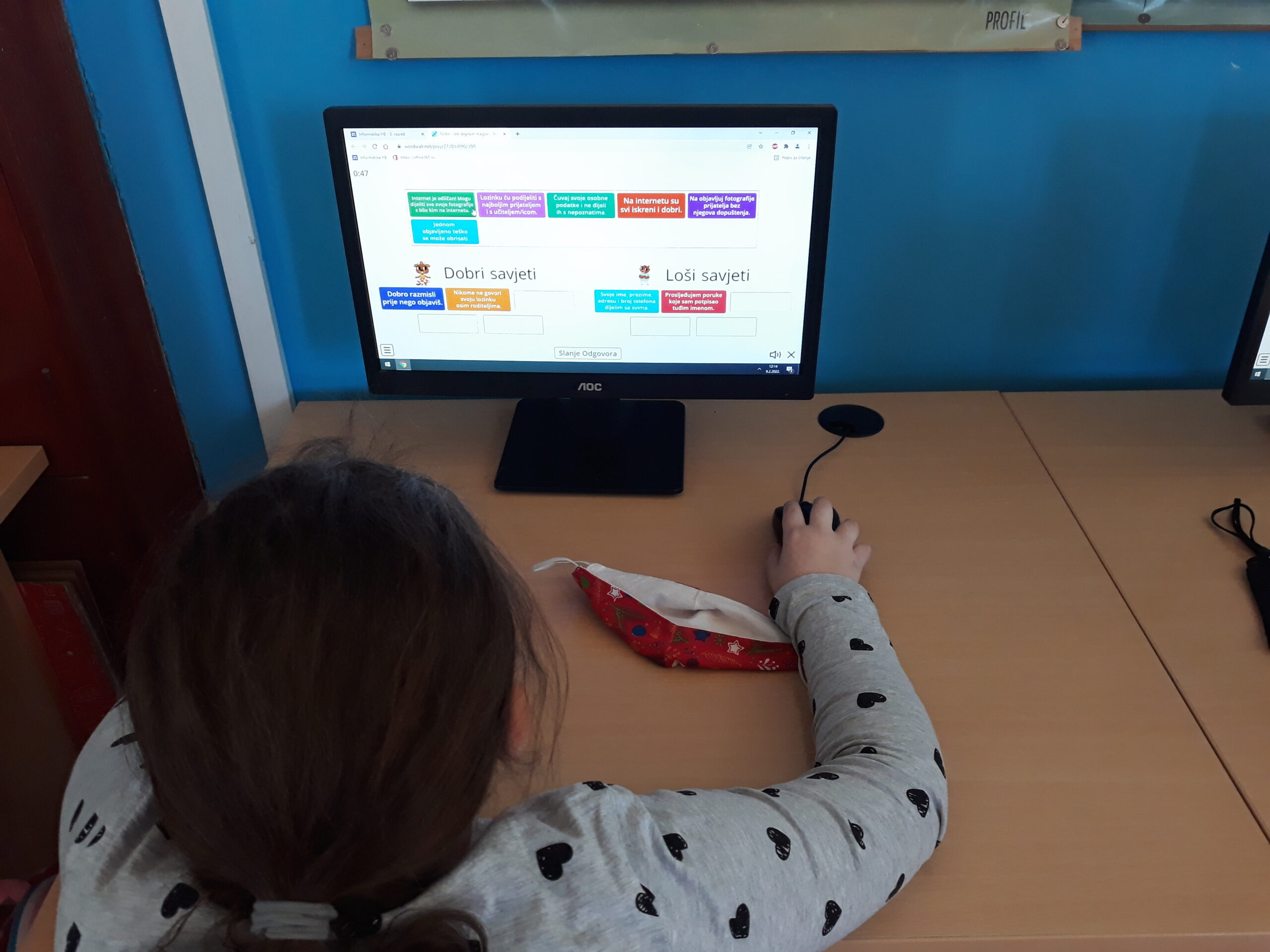 kojim se situacijama osjećaju (ne)sigurno, kako biti siguran i kako se štititi na internetu, što su osobni podaci i treba li ih dijeliti na internetu, prepoznati i pravilno koristiti emotikone, te savjete za rad na internetu. Na kraju su odigrali edukativnu igricu Dabrica Darka otkriva digitalni svijet. U igri, glavni lik je dabrica Darka, koja je razigrana i nestašna, znatiželjna i hrabra, rado se upušta u pustolovine i istražuje, pravi je pokretač i inicijator i nikad joj nije teško pokušati riješiti problem. U igri i rješavanju problema pomažu joj medo Marko i mudra sova. Oni su također i dobro društvo za vježbe rastezanja jer je uz igranje i učenje na računalu važno voditi i brigu o svom zdravlju. Igrica razvija svijest o primjeni digitalne tehnologije u osobnom i profesionalnom životu, posljedicama njezine primjene te pravima i odgovornostima digitalnog građanina. Svi su učenici uspješno odigrali igricu, riješili kviz na kraju igrice te svoju diplomu spremili u svoju mapu, a učiteljica je za cijeli razred ispisala na papir jednu zajedničku diplomu koju će istaknuti u svom razredu.