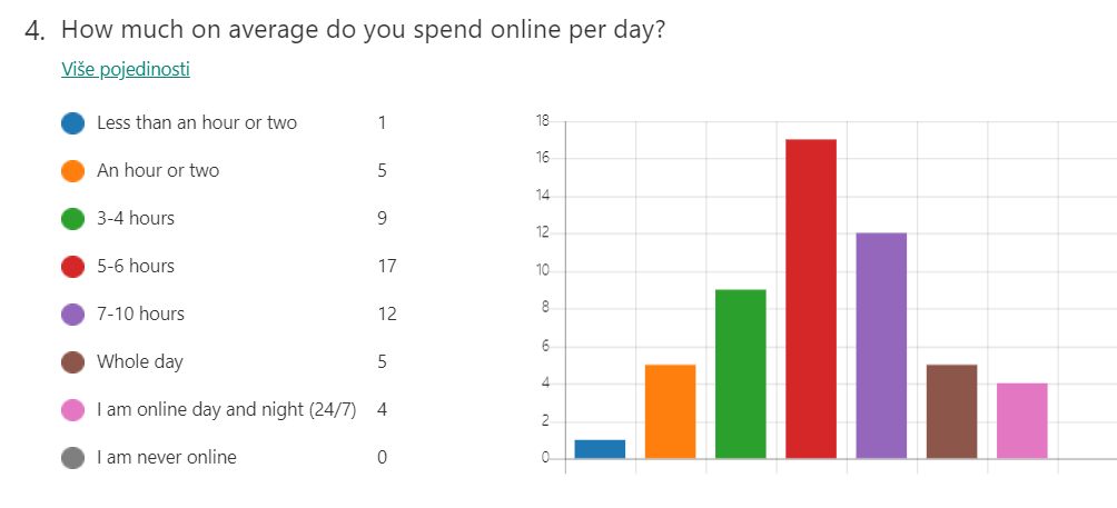 Pomoću grafičkog prikaza, moguće je vidjeti kako 29 ispitanika provodi od 5 do 10 sunčanih sati dnevno online. Prema podacima ankete 17 % učenika provede cijeli dan u online svijetu, ali postoje i učenici koji su rijetko u digitalnom okruženju, čak i u nastavi na daljinu.