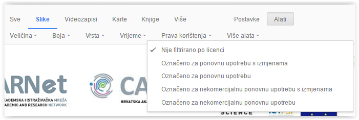 Prilikom pretraživanja slika putem Google tražilice mogu se zadati kriteriji pretraživanja slika s Creative Commons licencama, dok tražilica Bing u Office alatima automatski nudi samo takve slike.