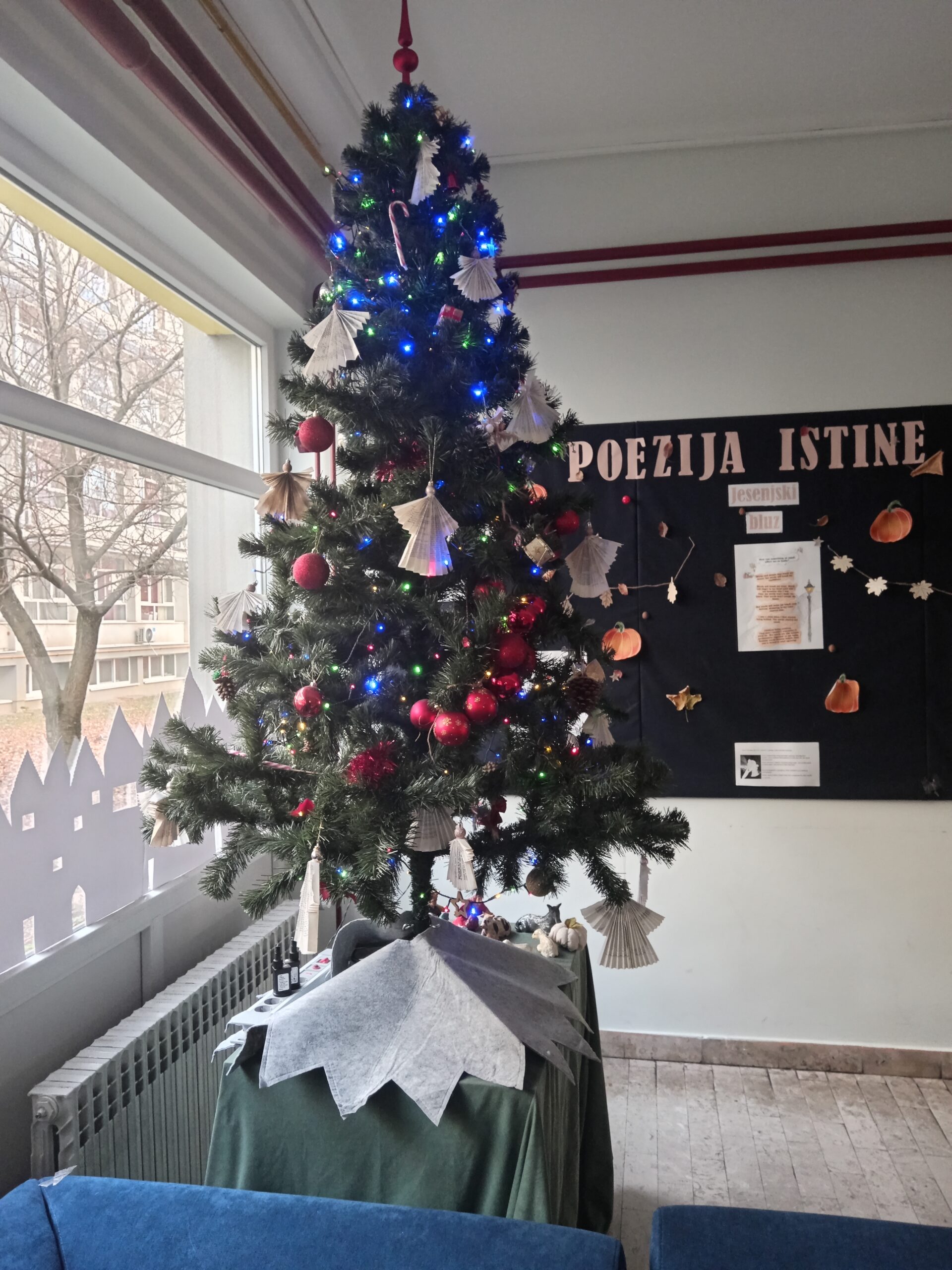 Središnji dio blagdanskog uređenja predstavlja božićni bor postavljen u holu škole, ukrašen ručno izrađenim ukrasima i svjetlosnim dekoracijama. Bor je postao vizualna središnja točka prostora te element koji doprinosi pozitivnoj atmosferi i identitetu škole u blagdanskom razdoblju.