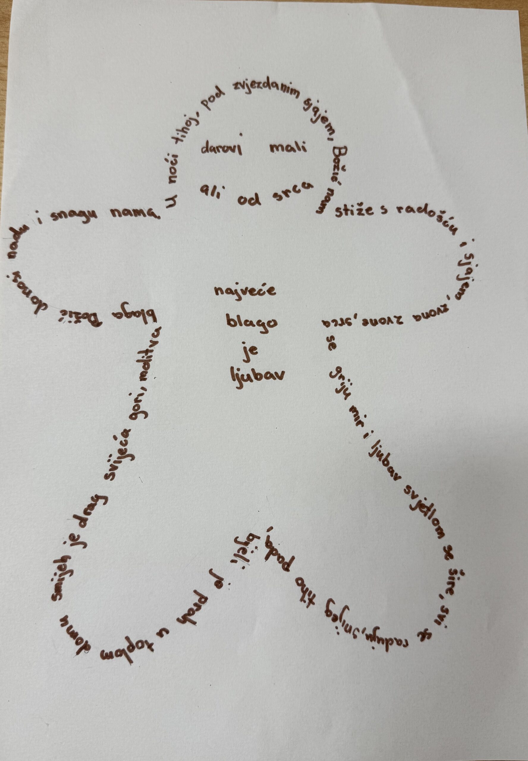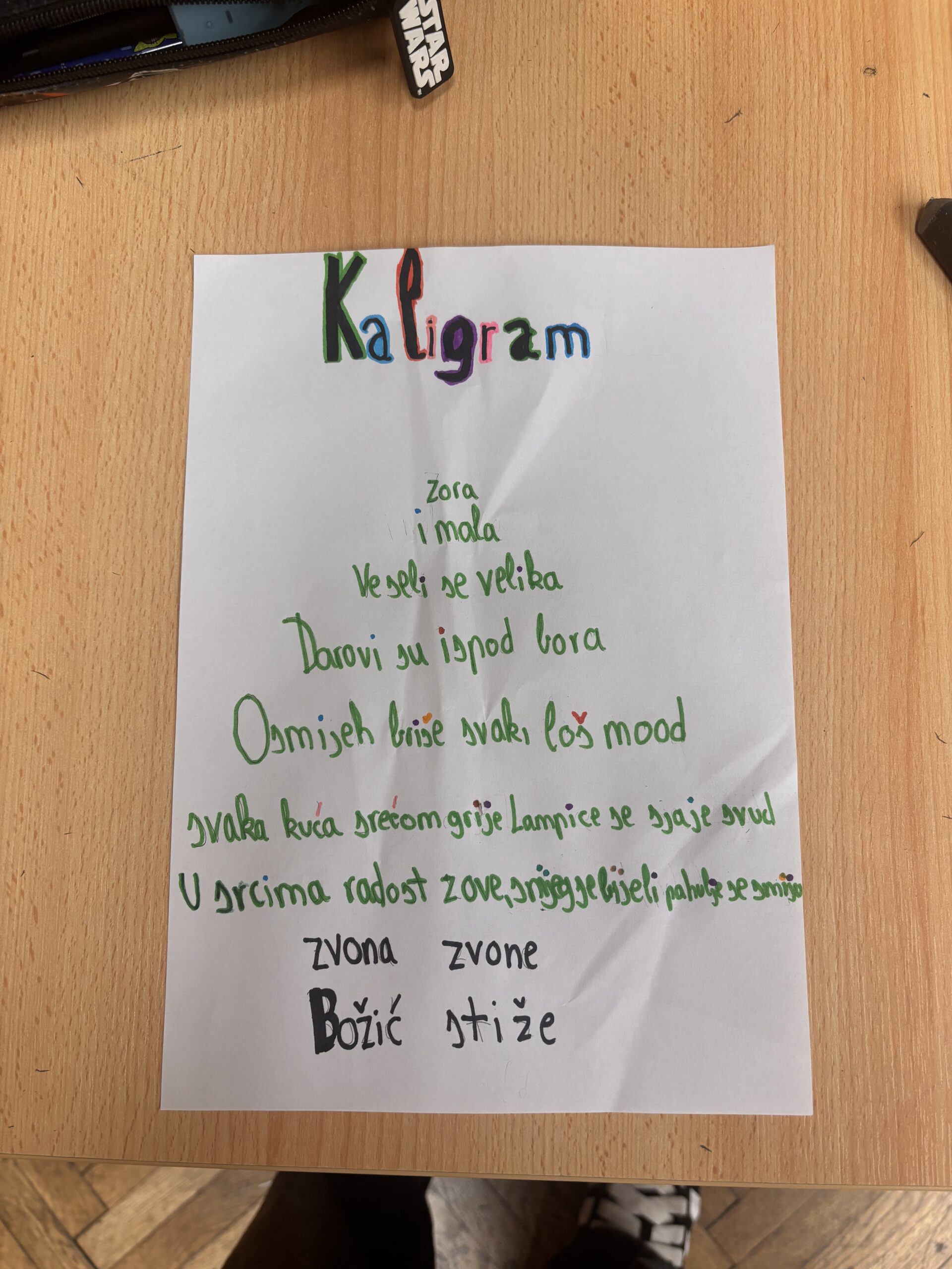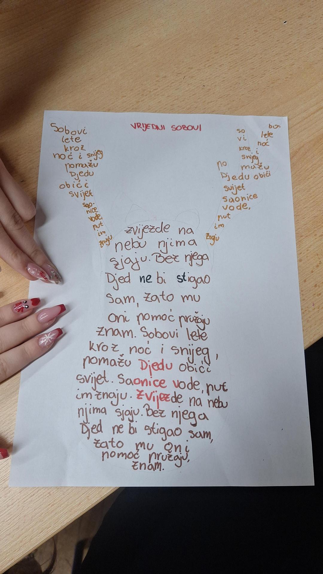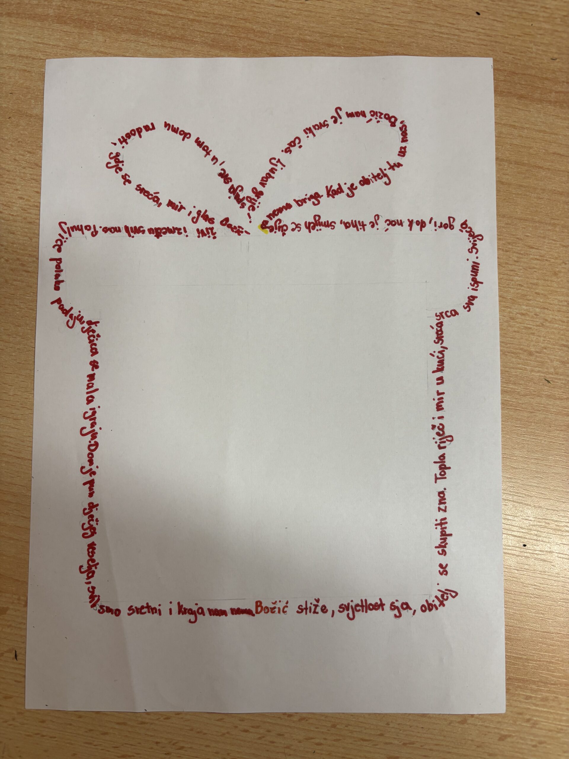 Inspirirani vizualnom poezijom Guillaumea Apollinairea, učenici su u grupama osmišljavali sinestetičke pjesničke slike, spajajući različita osjetila u jedinstven lirski doživljaj. Te su zapise potom ispisivali na velike formate papira, oblikujući ih u prepoznatljive božićne simbole.