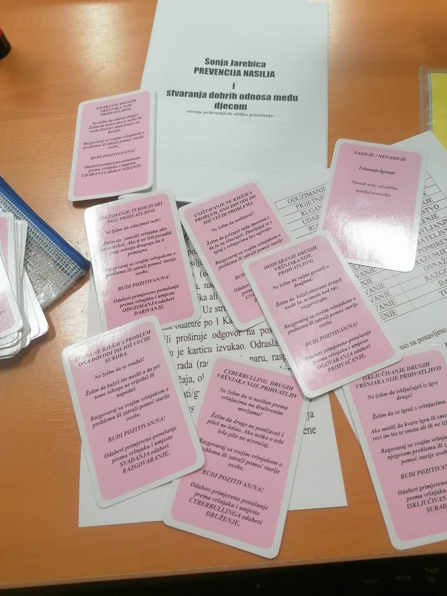 Završni zadatak odnosio se na prevenciju nasilja i stvaranja dobrih odnosa među djecom. Učenici su na osnovi tablice nepoželjnih i poželjnih oblika ponašanja učili da imaju mogućnost izbora ponašanja učenika u nasilnim situacijama (npr. udaranje-dogovaranje, ruganje-uvažavanje, vrijeđanje-poštivanje i sl.) te su učili imenovanje prihvatljivih/nenasilnih ponašanja. Uz pomoć učiteljice i knjižničarke učenici su još odabirali roza kartice tj. Kartice Nenasilja gdje smo svi zajedno ponavljali što danas naučili.