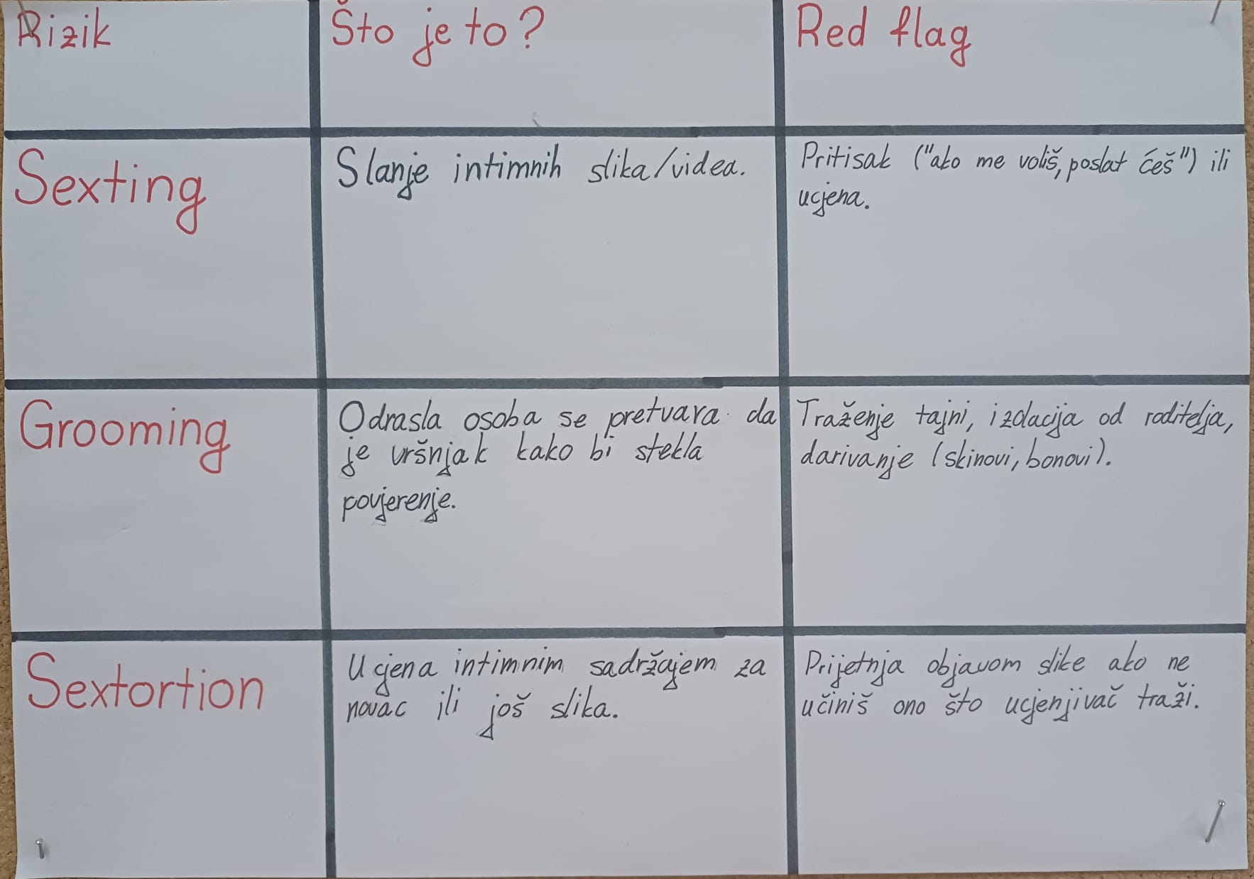 Učenici su učili prepoznavati manipulativni dizajn aplikacija i razumjeti digitalnu trajnost podataka. Upoznali su i rizične online situacije poput groominga, sextinga i sextortiona. Kroz raspravu i grupni rad analizirali su stvarne scenarije. Upoznali su i protokol postupanja u rizičnim situacijama: Stani – Snimi – Blokiraj – Prijavi.