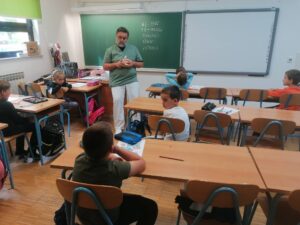 Također, učenicima je na modelu pokazao kako pravilno prati zube. Osim toga, učenici su imali još jednu aktivnost a to je bila provjera jesu li dobro oprali zube. Svaki učenik je popio plavu tekućinu i malo ju promućkao po zubima pa ispljunio. Rezultat je bio svima skoro pa isti. Zaključili su da većina učenika nije jutros dobro oprala svoje zube i imali su plave zubiće.
