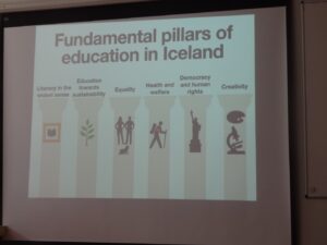 Predavači su pojasnili da su navedene kompetencije usklađene s temeljnim stupovima islandskog obrazovanja, a to su pismenost u najširem smislu, obrazovanje za održivost, jednakost, zdravlje i dobrobit, demokracija i ljudska prava te kreativnost. Te osnovne težnje njihovog obrazovanja uočljive su i kroz predmetni kurikulum kojeg u osnovnim školama čine slijedeći predmeti: islandski jezik, danski i engleski, prirodne znanosti, društvene znanosti, sport, plivanje, umjetnost, tekstil, domaćinstvo i obrada drveta. Građanski odgoj uključen je zajedno sa zemljopisom, povijesti i religijskom kulturom u društvene znanosti, ali je i sastavni dio  svih ostalih predmeta, odnosno kao i kod nas je međupredmetna tema.