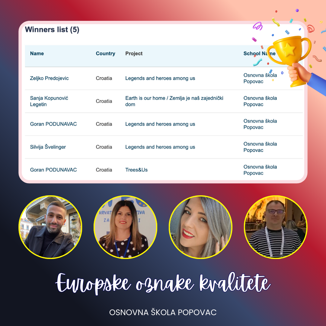 Ove godine Osnovna škola Popovac ponovno bilježi veliki uspjeh. Sedam djelatnika nagrađeno je za rad u međunarodnim projektima, a neki od njih ostvarili su i maksimalan broj od četiri oznake kvalitete u jednoj nastavnoj godini. Njihove prijave uspješno su ocjenjenje prema sljedećim kriterijima: pedagoške inovacije i kreativnost, integracija projekta u kurikulum, suradnja među partnerskim školama, kreativna uporaba informacijsko-komunikacijske tehnologije te rezultati, učinak i dokumentiranje projekta.
