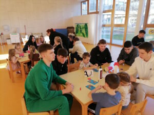 U vrtiću su učenici s vrtićancima sudjelovali u kreativnoj radionici izrade božićnih čestitki, koje će biti poslane partnerima projekta u Rumunjsku, Grčku i Litvu. Također, zajednički su izrađivali ukrase od recikliranog kartona za božićno drvce. Vrhunac radionice bilo je zajedničko ukrašavanje božićnog drvca u glavnom holu zgrade dječjega vrtića, koje je unijelo posebno blagdansko ozračje u vrtić.