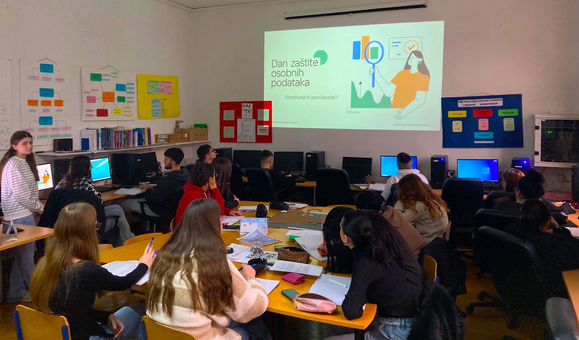 Učenici prvog razreda smjera Referent za poslovnu ekonomiju pripremili su i održali edukativne prezentacije o zaštiti podataka. Objasnili su što su osobni podaci, koja prava imamo prema GDPR-u i koje su najčešće prijetnje privatnosti na internetu. Nakon prezentacije, učenici su rješavali kviz znanja o sigurnom korištenju društvenih mreža.