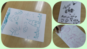 Nakon toga su učenici dobili zadatak da na poleđini papira nacrtaju svatko svoju sliku, opet samo jednom bojicom koju drže zajedno, opet bez dogovora, u potpunoj tišini. Za tu aktivnost su također imali minutu vremena.