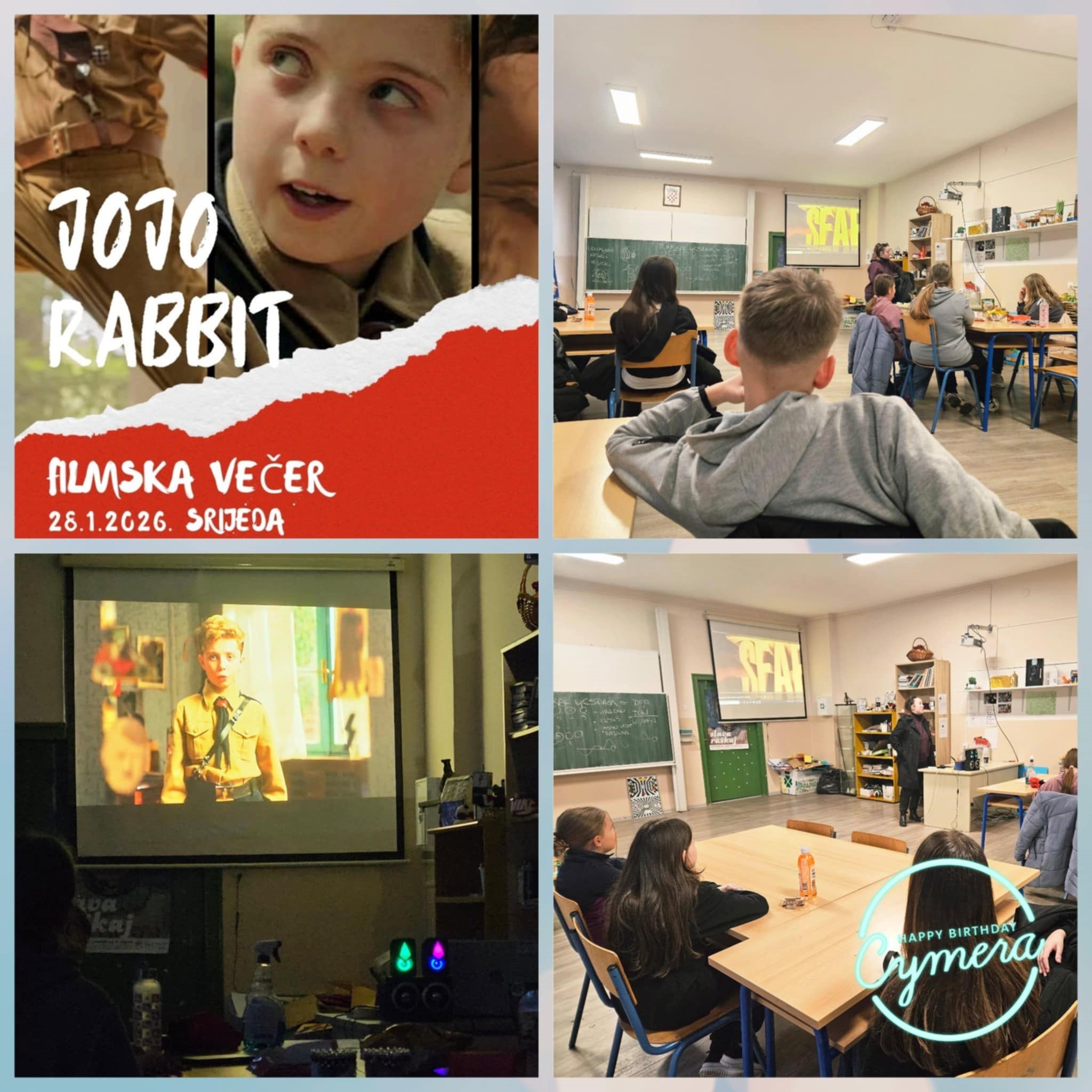 Filmska večer održana je u srijedu, 28. siječnja 2026. godine, s početkom u 16:00 sati, u prostoru škole. Tom je prigodom prikazan film Jojo Rabbit, redatelja Taike Waititija, koji na originalan, promišljen i mladima pristupačan način obrađuje teme Drugoga svjetskog rata, holokausta, ideologije, predrasuda i važnosti tolerancije.