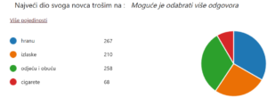 Drugi dio istraživanja odnosio se na financijsku situaciju, poznavanje vrsta kartica, te upravljanjem osobnim financijama. Čak 66 % ispitanika jedini izvor financiranja vidi u džeparcu kojeg dobiva od roditelja, ali je pohvalno što je 23 % zaposleno sezonski. Učenici su skromni, 75 % ih smatra da su im primanja dostatna za vlastite potrebe i njih čak 71 % smatra da zna upravljati svojim financijama. Ipak je zabrinjavajuće što 25 % preostalih lako priznaje da su kompulzivni potrošači.