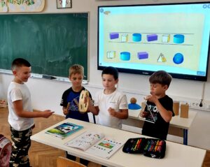 Matematika je prirodna znanost i kao takva čvrsto je povezana sa svim aspektima života i rada, pa tako i s umjetnošću. U prvom razredu Vesele učionice Osnovne škole Tučepi od prvog nastavnog dana spajaju se školski sati i povezuju sadržaji koliko god je moguće. Prve školske dane obilježila je igra geometrijskim tijelima koja prepoznajemo posvuda oko nas. Mali prvašići vole fizičke aktivnosti na otvorenom, stoga vole sudjelovati u kuglanju geometrijskim tijelima gdje neposrednim opažanjem uočavaju koji su geometrijski oblici prikladniji za ulogu čunjeva, a koji su najbolji u ulozi kugle koja ih ruši.
