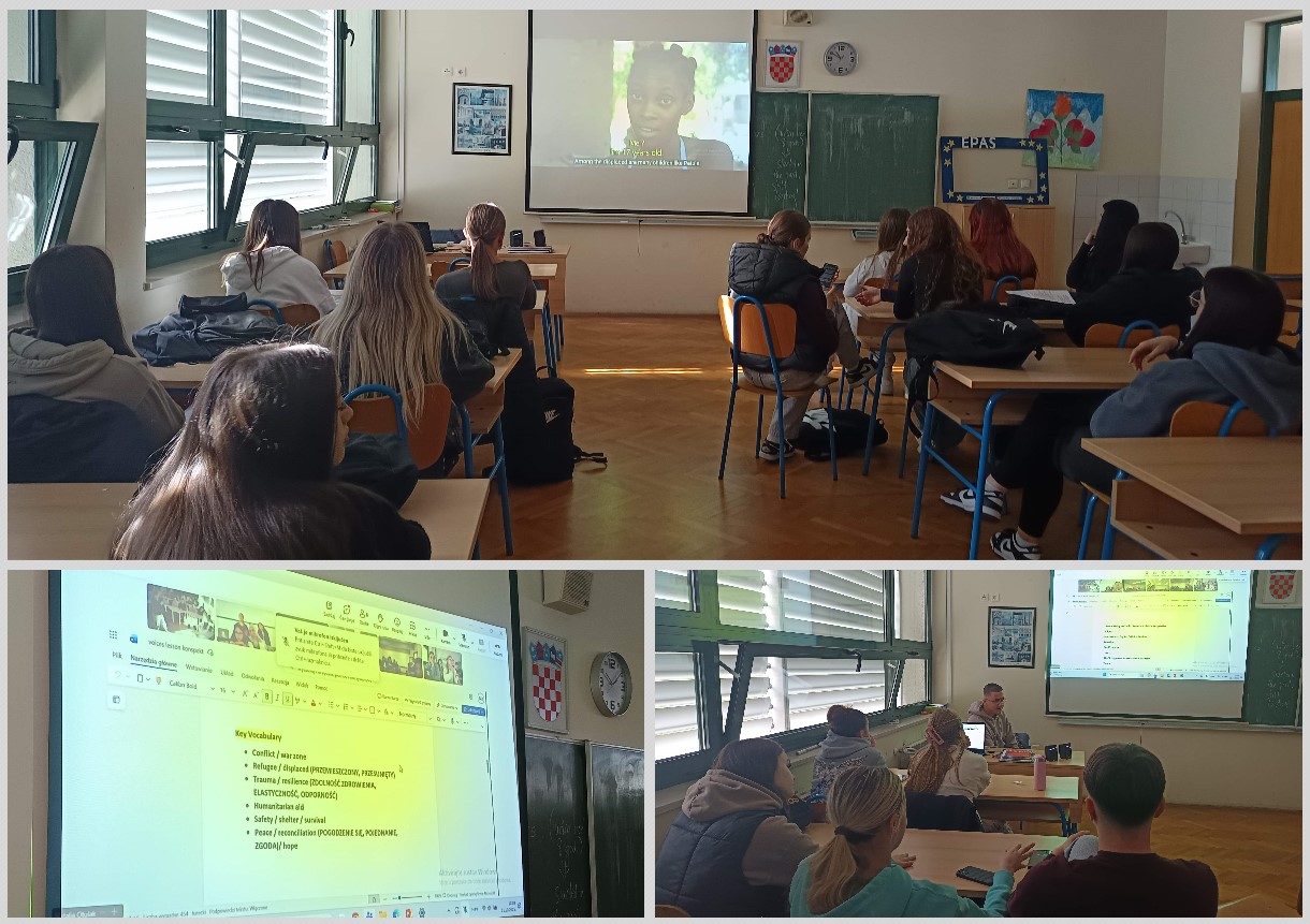 Na početku drugoga projektnog modula, 21. listopada 2025. (10.00 – 11.00), nastavnici i učenici iz partnerskih škola održali su zajednički “online English lesson” / radionicu “Living in Conflict Zones – A Child’s Perspective” kako bi, na temelju autentičnih materijala (poput videa When Will the Fighting Stop – UNICEF), saznali o “životu u zonama sukoba – iz dječje perspektive“. Online radionicu moderirala je Natalia Otulak, nastavnica Engleskoga jezika iz Poljske.