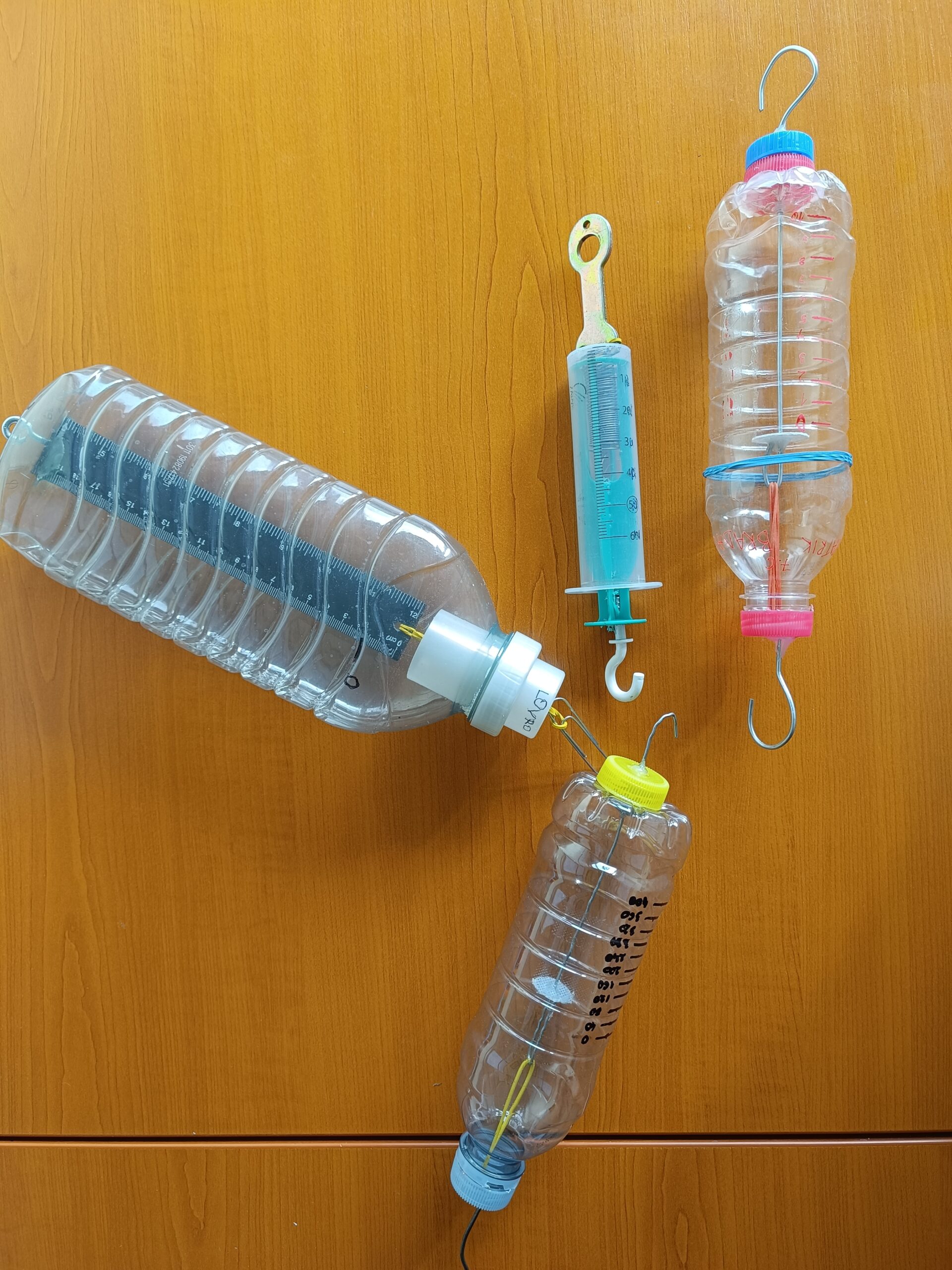 Koristili su sljedeće materijale: opruge, gumice za domaćinstvo, plastične boce, medicinske šprice, boce omekšivača, metalne matice, kuke za vješanje tereta i druge slične materijale koje svakodnevno koristimo. Pri izradi su još koristili selotejp, univerzalno i vruće ljepilo.