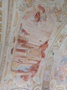 Vlč. Mlakar napomenuo je kako nema pisanih dokumenata, a predaja govori da se godinu dana nakon posvete župne crkve u kapelici dvorca Batthyany 1411. god. dogodilo euharistijsko čudo. No, pretpostavlja se da se euharistijsko čudo dogodilo u crkvi Presvetoga Trojstva, a ne u kapeli Sv. Križa u dvorcu Batthyany. Nakon osobnog svjedočanstva o svećeničkom pozivu i zajedničke molitve Litanija Krvi Kristove župnik vlč. Mlakar istaknuo je i važnost osobne spontane molitve Gospodinu i pozvao da se svatko u tišini sa svojim zahvalama i potrebama obrati Gospodinu. Obilazeći oko glavnog oltara učenici su razgledali freske Mirka Račkog koji se rodio u Novom Marofu nakon čega su kupili nabožne predmete koje im je blagoslovio župnik vlč. Mlakar te su se uputili u daljnje razgledavanje ludbreških znamenitosti.