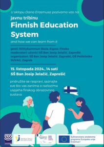 U sklopu obilježavanja Dana Erasmusa 2024. u Srednjoj školi Ban Josip Jelačić u suorganizaciji s OŠ Poliklinike Suvag, organizirana je javna tribina „Finnish education system and how we can learn from it“.