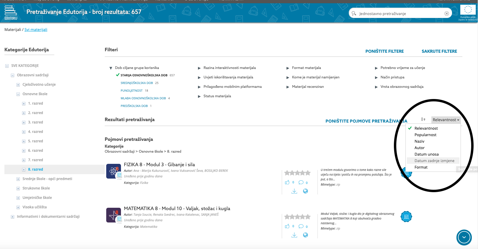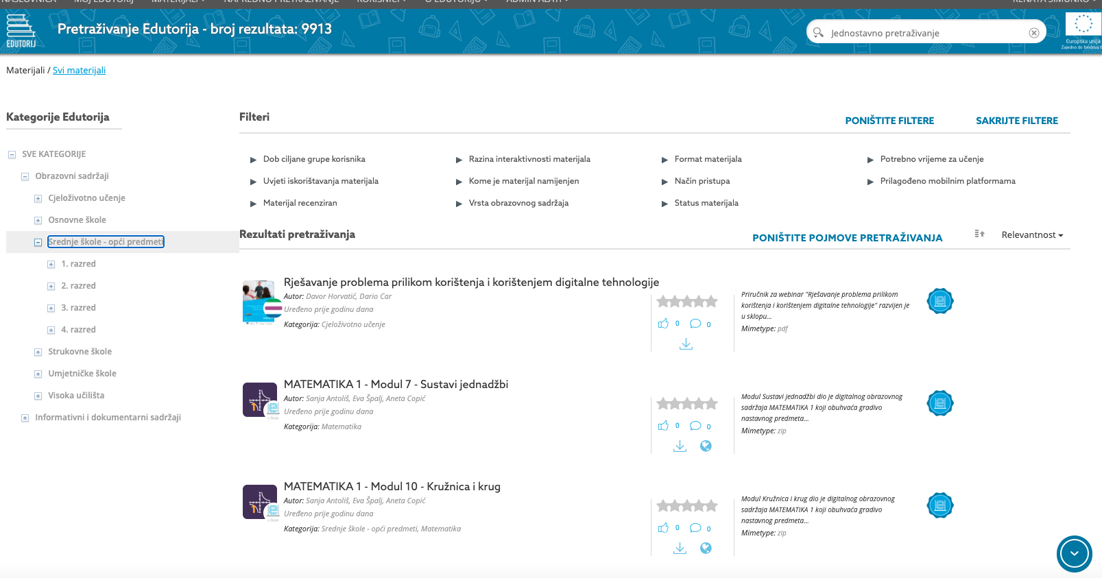 Tako nam npr. klikom na pojam “osnovne škole“ sustav prikazuje popis svih materijala namijenjenih za osnovne škole i vidimo da se radi o većem broju materijala: