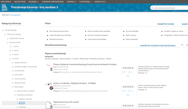 Zalazeći dublje u strukturu smanjuje se i broj dostupnih materijala i lakše pronalazimo što nas zanima, pa odabirom npr. domene “brojevi“ za predmetni kurikulum matematike za 4. razred OŠ dobili smo rezultat od 3 materijala: