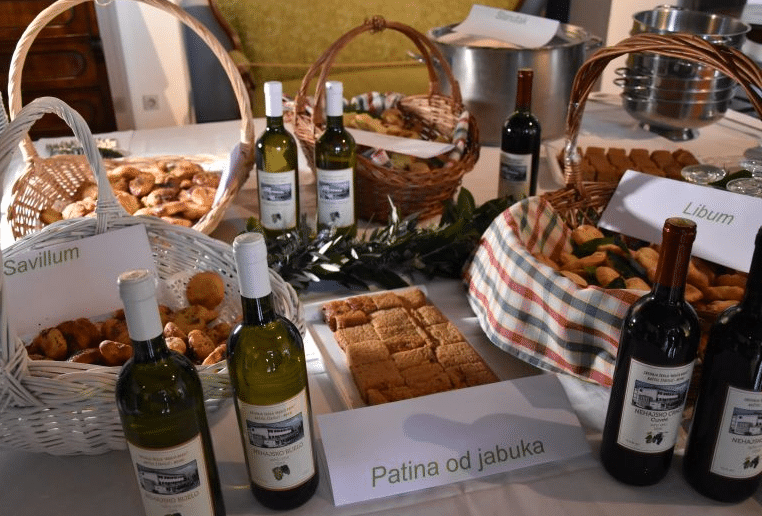 U davnim vremenima, antička jela su pripremana uglavnom bez mesa uz obilno korištenje žitarica, grahorica, ribe, sira i različitih začina. Gostima je ponuđeno varivo od slanutka, graha i leće, kuhano u vinu s dodatkom inćuna, maslinovog ulja i začina. Uz varivo se mogao jesti libum (beskvasni žrtveni kruh sa sirom i jajima) ili lebum (u kojem ima kvasa, mlijeka, sira, jaja, maslina i meda). Od slatkih rimskih delicija na stolu su se našle savillum (pogačice slične libumu, ali slatke, s medom i makom) te patina od jabuke (sočni kolač od jabuke, prošeka, meda, maslinovog ulja, limuna i začina). Pravi užitak bio je conditum paradoxum, aromatično začinjeno vino (korišteno je Nehajsko bijelo, proizvedeno u školskom podrumu), s dodacima lovora, šafrana, papra, datulja i meda.