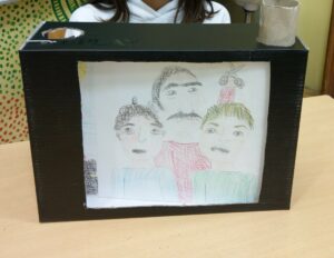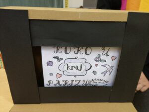 - c) prednju stranu kutije izreži i napravi prozorčić – veličina prozorčića i papira na kojima će se nalaziti okviri crteža treba biti jednaka