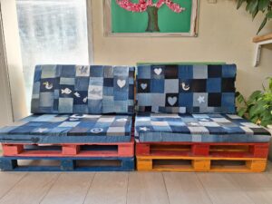 Proveli smo zanimljivu aktivnost izrade novih predmeta od starih. Od doniranog jeansa izradili smo patcwork tehnikom navlake za jastuke. Oni su postali udobni dodatak i ukras naslonjačima od drvenih paleta koje su izradili učenici s učiteljima uključenima u Erasmus.