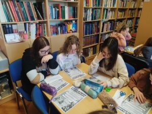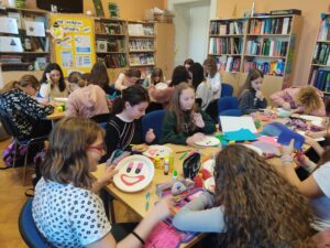 Zatim je slijedila radionica maski… Ideja za izradu maski uzeta je iz Edukativnih materijala na bazi Montessori pedagogije. U današnje vrijeme velika se pozornost stavlja na informatičko opismenjavanje svih sudionika odgojno-obrazovnog procesa. Pomalo se zapostavlja razvoj psihomotorike ruke, šake, prstiju… Ukoliko omogućimo učenicima i takav razvoj, ono će moći kreativno misliti i izražavati se, što uvelike utječe na njegov budući razvoj. Budući da učenici najbolje uče kada sudjeluju u aktivnosti i putem igre, mali knjižničari su se zaigrali i stvoriti nešto novo, izrazili svoju kreativnost. Maske su našle i svoje mjesto u holu škole te ih uvode u atmosferu veselja i šarolikosti prevrtljive veljače.