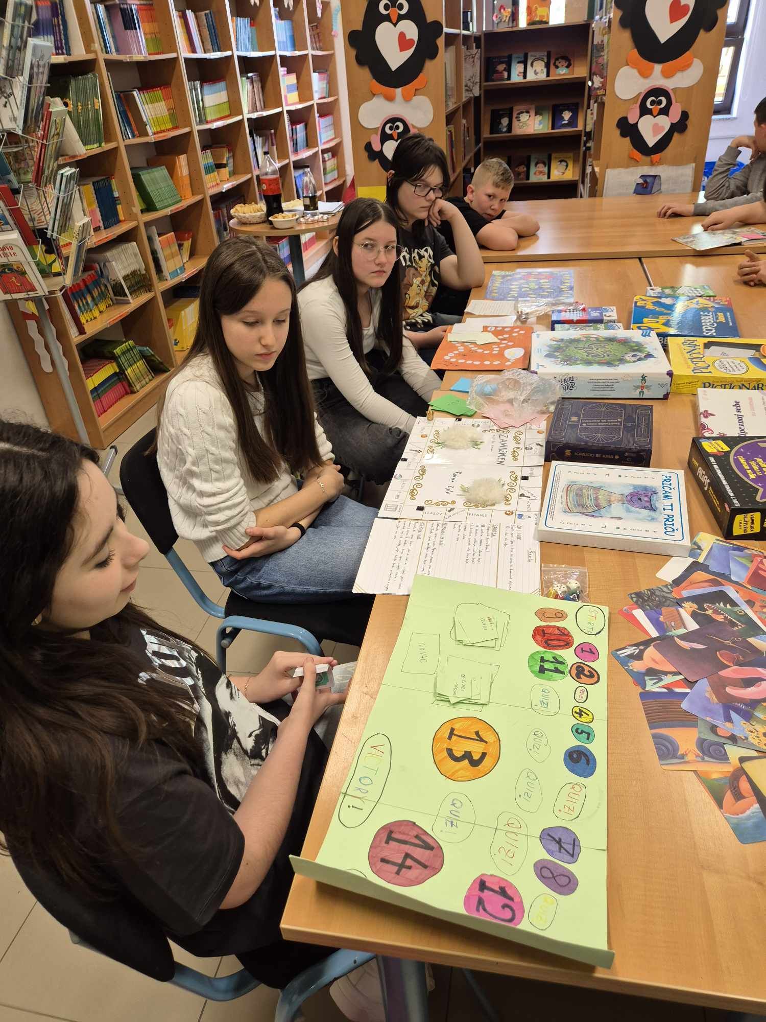 U knjižnici su ih dočekale brojne društvene igre poput Pictionaryja, Aliasa, DiXita, šaha, igre „Igrajmo se kina“ i mnoge druge. Uvod u sat bio je zanimljiv: knjižničarka je učenicima postavila zagonetke koje su trebali riješiti, a zatim su svi zajedno odigrali igru „Mjenjaža“.