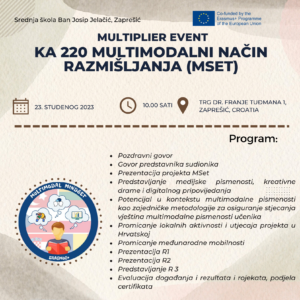 U sklopu projekta Erasmus+ KA220 projekta “Multimodal Mindset” (MSet), u četvrtak, 23. studenoga 2023. u prostorijama Srednje škole Ban Josip Jelačić, održat će se događaj s multiplicirajućim učinkom (multiplier event) pod nazivom “KA 220 Multimodalni način razmišljanja (MSet”).