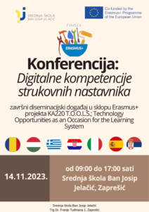 U utorak, 14.studenog 2023. organizirali su cjelodnevnu Konferenciju pod nazivom “Digitalne komeptencije strukovnih nastavnika” na kojoj je sudjelovalo više od 40 nastavnika te predstavnika Agencije za strukovno obrazovanje i obrazovanje odraslih. Uvodno izlaganje je održao ravnatelj škole, dr.sc. Alan Labus o srednjoškolskom strukovnom obrazovanju u RH te transformativnim procesima prema europskim obrazovnim agendama. Kao gost na Konferencije je sudjelovala viša savjetnica iz ASOO-a Vedrana Šimunić Rod, koja je govorila o modernizaciji strukovnog obrazovanja koja nas uskoro očekuju kroz uvođenje modularno strukturiranih kurikuluma.