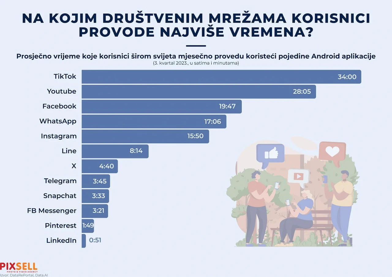 TikTok dominira s nevjerojatnih 34 sata mjesečno po korisniku, dok YouTube zauzima drugo mjesto s oko 28 sati.