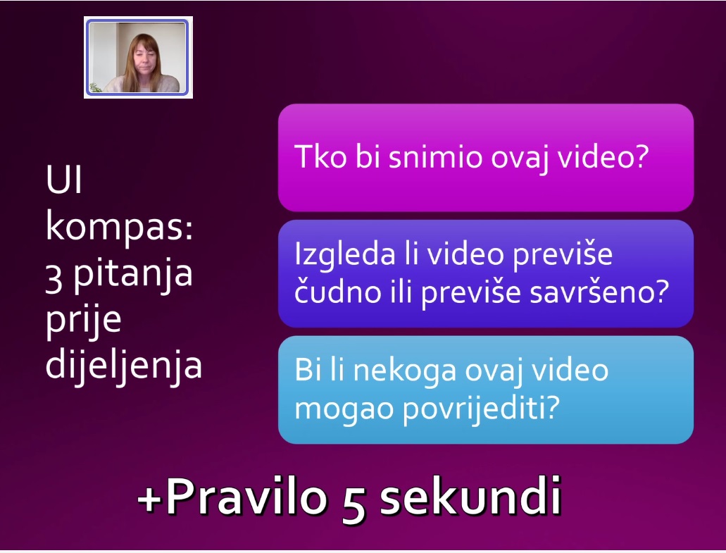 Kritičko vrednovanje video sadržaja bilo je u fokusu predavanja „Pametan video ili pametan izbor?“, koje je održala Dalia Kager, mag. prim. educ., savjetnica (OŠ Eugena Kvaternika, Velika Gorica), pruživši sudionicima konkretne smjernice za prepoznavanje manipuliranih i generiranih videozapisa.
