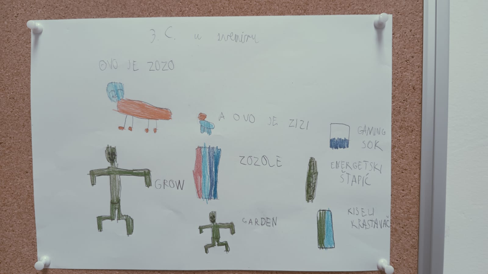 Svaki je učenik dobio vlastiti likovni zadatak: crtanje rakete, robota Totija, planeta Geminga, njegovih stanovnika i kućnih ljubimaca, slastičarnice, jelovnika i novih prijatelja. Crteži su potom opisivani i postavljeni na školski pano prema slijedu događaja.