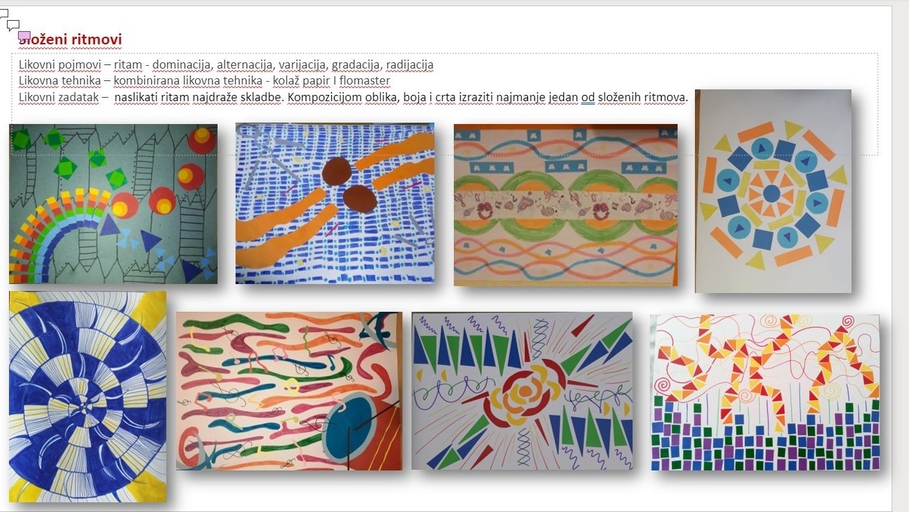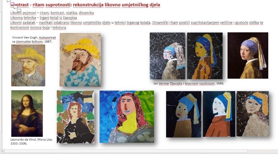 Tako je u virtualnoj učionici fizički izloženi prostor za radove uspješno zamijenila PowerPoint prezentacija. Na svakom slajdu prezentacije izloženo je nekoliko radova koji su nastali kao promišljanje o jednoj likovnoj temi, odnosno zadatku. Kako bi se prije pisanja kritičkog osvrta učenici prisjetili likovne teme i zadatka, njihovo pojašnjenje je ispisano iznad izloženih fotografija radova. Vođenim pitanjima istaknutim na početnom slajdu prezentacije, koje će učenici koristiti za vrednovanje naučenog, učiteljica je usmjeravala učenike na sastavnice na koje je potrebno obratiti pažnju – kriterije prema kojima će vrednovati uratke. Zadatak učenika je bio vrednovati radove izložene na određenom slajdu pisanjem komentara za taj slajd. Pisanje dijaloškog okvira za komentar aktivira se jednim klikom u gornjem desnom uglu prezentacije. Komentar se može naknadno uređivati, na njega mogu drugi korisnici pisati svoje komentare. Pošto su učenici pregledavali prezentacije putem poveznice s ograničenim pristupom nisu mogu uređivati slajdove već ih samo pregledavati, pisati i uređivati komentare. Aktivnosti učenika su transparentne, jer spomenute provode pod svojim CARNET korisničkim računom.
