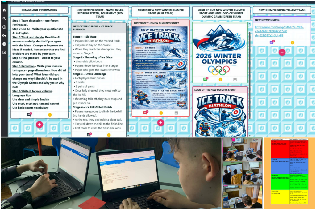 Aktivnosti su osmišljene tako da učenici umjetnu inteligenciju koriste kao alat za podršku učenju i poticaj za ideje, a ne kao zamjenu za vlastito razmišljanje i donošenje odluka. U okviru jedne od projektnih aktivnosti učenici su dobili zadatak osmisliti novi zimski olimpijski sport, kao i prateće elemente poput plakata, loga i olimpijske pjesme.