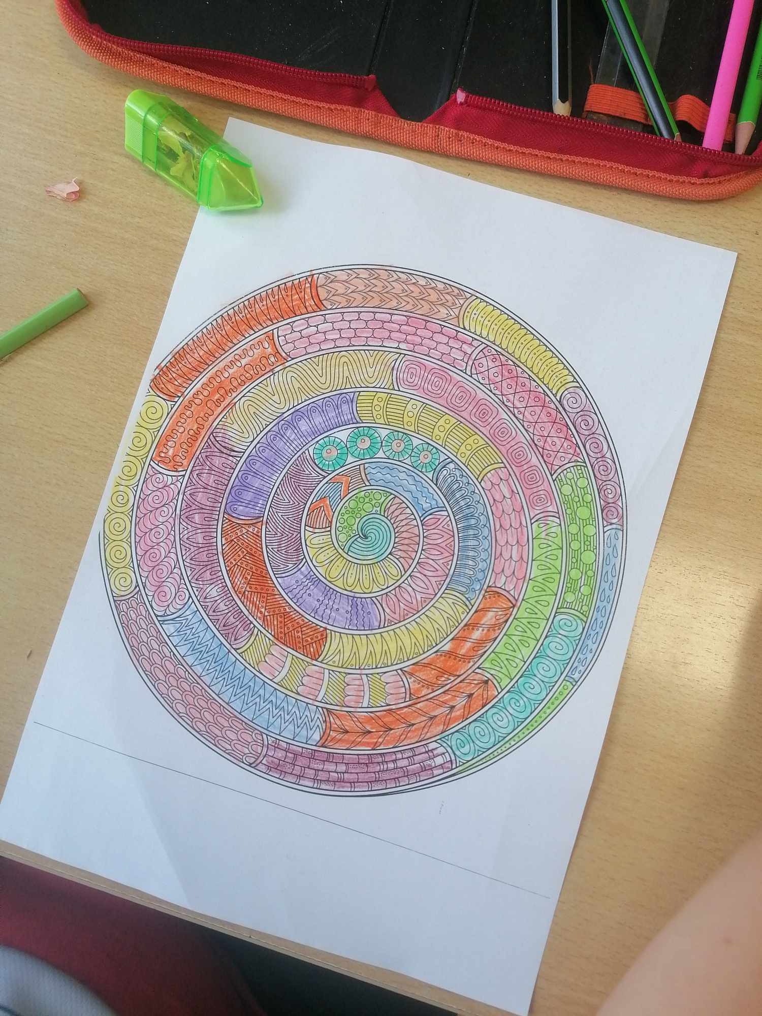 Nastavili su i dalje biti dijelom Jurske škole. Učenici su dobili mandale koje su trebali bojati drvenim bojicama i nastaviti u tonu opuštanja. To je slika koju stvaraju uzorci i simboli koji se ponavljaju unedogled. Dobiveni su predivni dječji radovi koji će biti izloženi u hodniku škole. Uslijedila je igra gumi-gumi. S obzirom da je vani padala kiša, igra je odigrana u razredu. Djeca su naučila nove korake i novu igru.