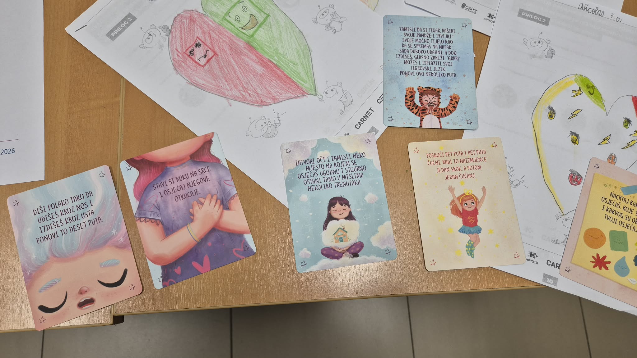 U završnom dijelu radionice učenici su upoznali SOS kartice za opuštanje koje potiču razvoj strategija samoregulacije. Jedna od aktivnosti bila je izvođenje naizmjeničnih skokova i čučnjeva kao jednostavne tehnike za smirivanje i oslobađanje napetosti. Posebno zanimljiva vježba bila je: „Zamisli da si tigar, raširi svoje pandže i izvijaj svoje moćno tijelo kao da se spremaš na napad… sada duboko udahni, a dok izdišeš, glasno zareži: Grrrr!“, nakon čega su učenici stavili ruku na srce i osluškivali njegove otkucaje.