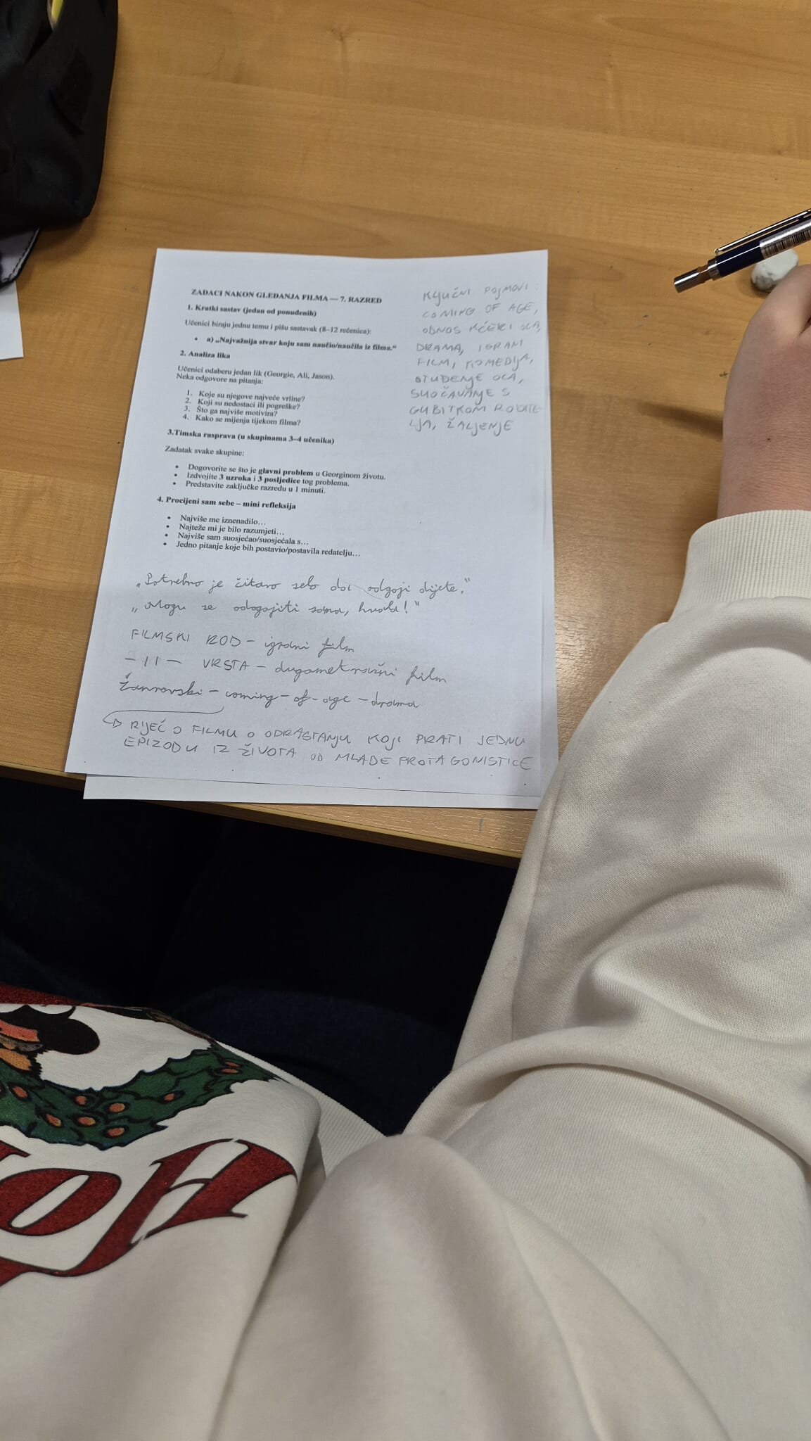 Nakon projekcije, učenici su bili podijeljeni u tri skupine. Svaka skupina analizirala je jedan lik: Georgie, Ali ili Jason. Zadatak je bio ispuniti tablicu o karakteristikama, vrlinama, nedostacima, motivacijama i promjenama kroz film.