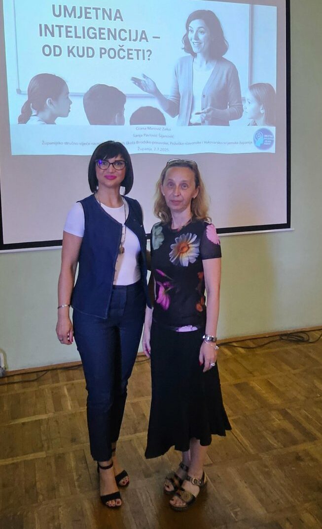 Upravo o toj aktualnoj i višedimenzionalnoj temi bilo je posvećeno predavanje pod nazivom „Umjetna inteligencija – od kud početi“, koje su u okviru Županijskog stručnog vijeća ravnatelja srednjih škola Požeško-slavonske, Brodsko-posavske i Vukovarsko-srijemske županije, 2. srpnja 2025. godine u Obrtničko-industrijskoj školi u Županji, održale Giana Marović Zeko, ravnateljica Gimnazije Vukovar, i Sanja Pavlović Šijanović, nastavnica informatike.