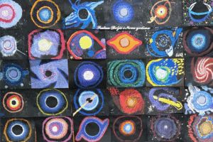 Metodičkim izložbama Likovne kulture namijenjen je zid polukata središnjeg stubišta škole. U tom prostoru, koji omogućava promatranje učeničkih izložaba s tri razine, u listopadu je izlagana podtema Makrokozmos iz tematske cjeline posvećene ljudskim osjeti(li)ma. Ukupno su bile postavljene sedamdeset dvije slike šestih razreda. Budući da učenici sami nisu opažali putem teleskopa, već slikajući uvježbavali svojstva boje – ton i valer, neposrednost doživljaja pri slikanju fenomena svemira omogućile su im NASA-ine fotografije koje su pronašli. Izložbu su dokumentirali članovi likovne skupine „Vizualni identitet“.