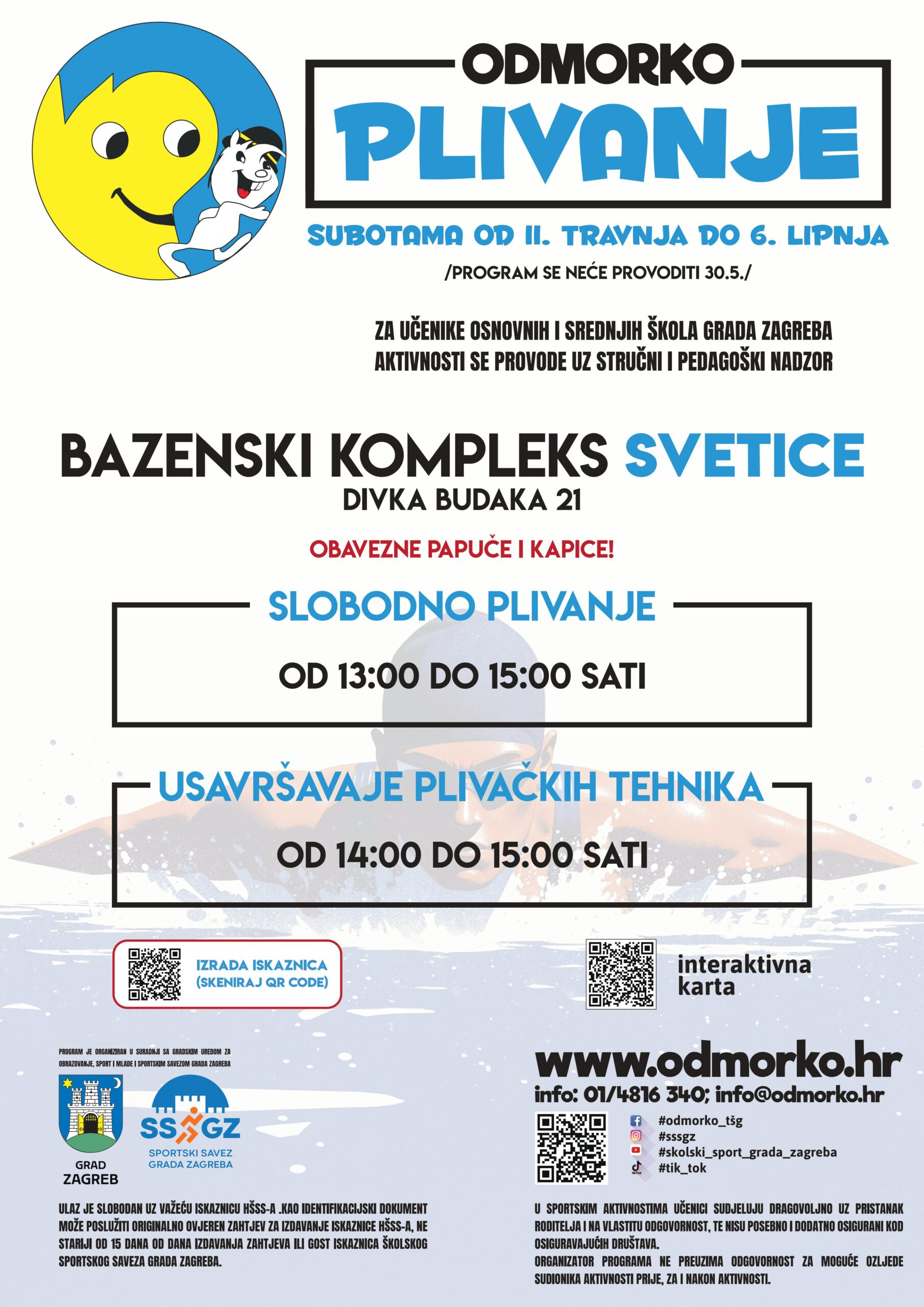 Školski sportski savez Grada Zagreba u subotu 11. travnja 2026. godine kreće sa novom sezonom slobodnog plivanja i usavršavanja plivačkih tehnika na bazenu Svetice, a u sklopu programa Odmorko tijekom školske godine.