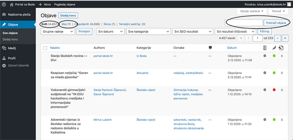 Opcija ‘Sve objave‘ omogućuje pregled i pretraživanje svih ranijih objava na Portalu škole.hr po naslovu, autorima, kategorijama, oznakama i datumu objave. Pretragu možete izvršiti na način da u polje za pretraživanje (nalazi se pri vrhu stranice Objava) upišete jedan od poznatih kriterija po kojima želite pronaći objavu i kliknete na ‘Pretraži objave‘.