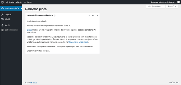 Klikom na ‘Profil‘ u bočnom izborniku ili ‘Uredi profil’ u gornjem izborniku omogućuje se pristupanje opciji uređivanja profila pomoću koje možete prilagoditi osobne opcije profila, kao i pogledati i izmijeniti vaše korisničke podatke. Ukoliko uočite da su neka polja prazna, a znate te podatke ili pak WordPress traži podatke (označene (*) zvjedicom) molimo da iste popunite kako bi bili što optimalniji korisnik platforme. Nakon što ste unijeli promjene, kliknite Ažuriraj profil.