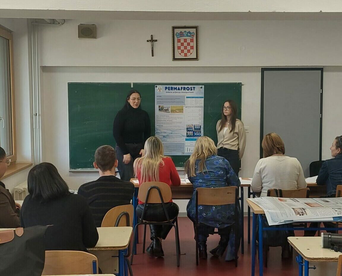 U teorijskom dijelu rada prikazani su primjeri mikroorganizama pronađenih ili izoliranih iz područja permafrosta, poput uzročnika antraksa, bubonske kuge i tularemije, virusa malih boginja te virusa Pithovirus sibericum. Učenice su ukazale na moguće biosigurnosne rizike povezane s klimatskim promjenama i otapanjem ledenog tla.