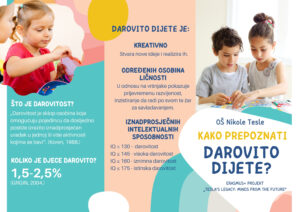 Brošura Darovito dijeteSudionici projekta organizirali su obilježavanje Dana darovitih učenika u ožujku 2022. godine održavanjem radionica za učenike koje su pripremili i održali potencijalno daroviti učenici uz mentorstvo učitelja. Učenici su se upoznali s osnovama programiranja bez računala, radili su na jačanju suradnje i timskih vještina uz pomoć dramskih igara, okušali su se u šahu te naučili razliku između britanskoga i američkog engleskog jezika. Na STEM radionicama učili su o razlomcima uz pomoć glazbe, o prijenosu energije i  kako spojiti strujni krug, a na CLIL radionici demonstrirali su pokuse. Prvašići su sudjelovali na radionici rješavanja problemskih zadataka, a učenici produženog boravka prezentirali su svoje plakate koji su nastali samostalnim istraživanjem u sklopu Genius hour metode. Najvažnija aktivnost projekta bio je TeslaFest, festival znanosti, umjetnosti i talenata koji je obilovao radionicama različitih sadržaja, od pokusa, forenzike, izrade holograma i 3D naočala do dramskih radionica i predstava. Učenici su također pokazali svoje talente. Posjetitelji su mogli uživati u pjesmi, plesu, dramskim predstavama, zumba nastupima, izložbama fotografija, likovnih radova te pletiva.