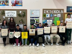 Grupa nastavnica i nastavnika škole donijela je svoje najdraže platnene vrećice, kako bi potakli učenike i kolege da razmisle o vlastitim navikama – koristimo ono što volimo i čuvamo okoliš. Čuvajmo planet, nosimo platno!