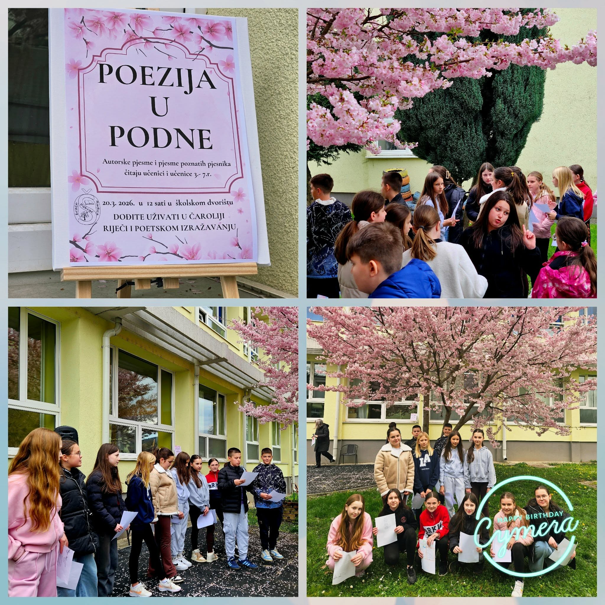 Središnji dio obilježavanja upriličen je 20. ožujka 2026. godine u atriju škole, uz procvalu japansku trešnju, gdje su učenici čitali svoje radove nastale tijekom radionice, ali i interpretirali pjesme poznatih pjesnika. Time su imali priliku predstaviti svoju kreativnost, razvijati izražajno čitanje i osnažiti samopouzdanje u javnom nastupu.
